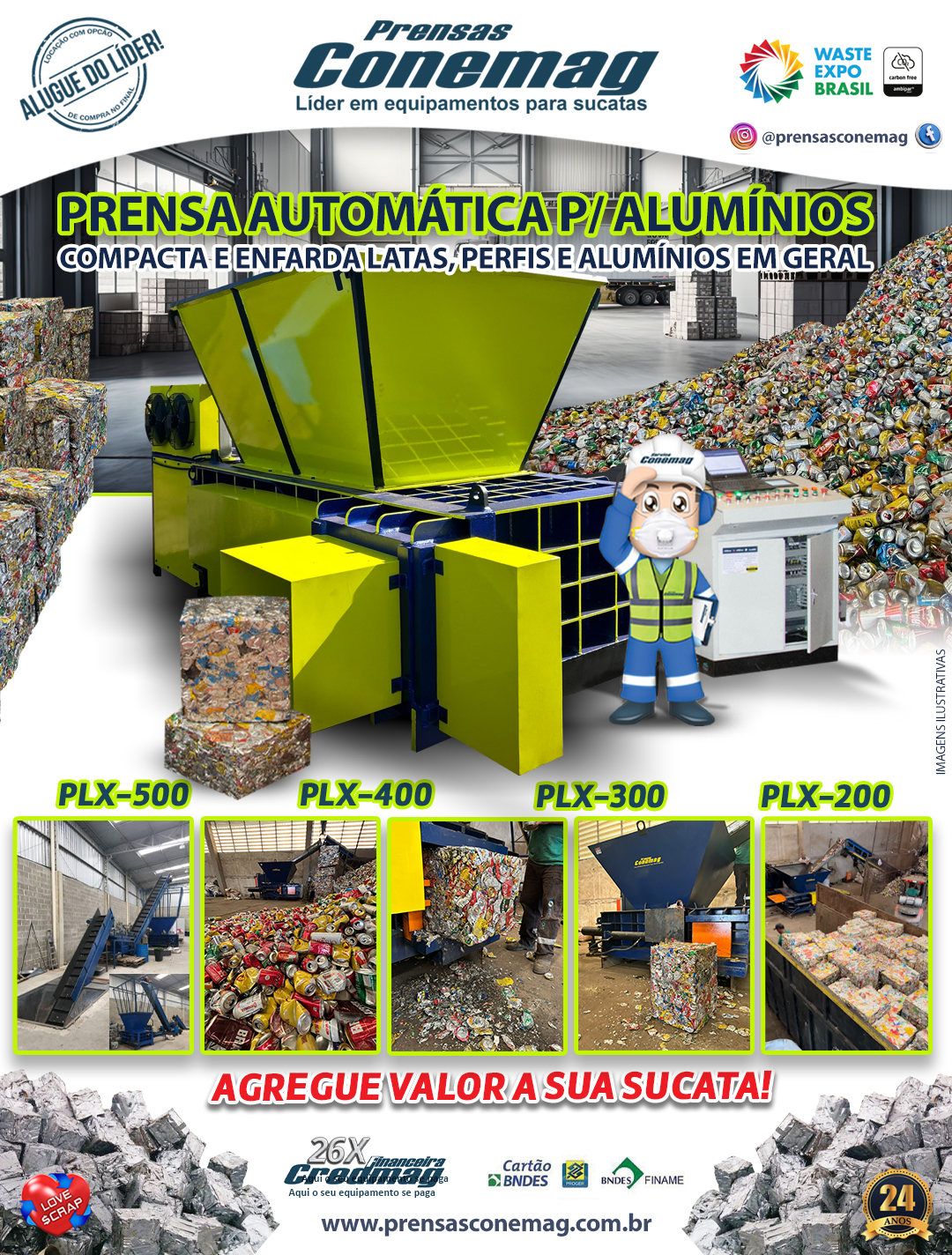PLX – Prensa Automática Contínua para Alumínios Conemag: Equipamento compacto e robusto, projetado para alta produção com baixo custo de manutenção, seguindo as normas de segurança NR12. Ideal para operações contínuas, entrega fardos de alta densidade, otimizando manuseio, armazenamento e transporte. Possui facas de corte, revestimento interno, silo de abastecimento e bomba de pistão variável para maior eficiência energética.