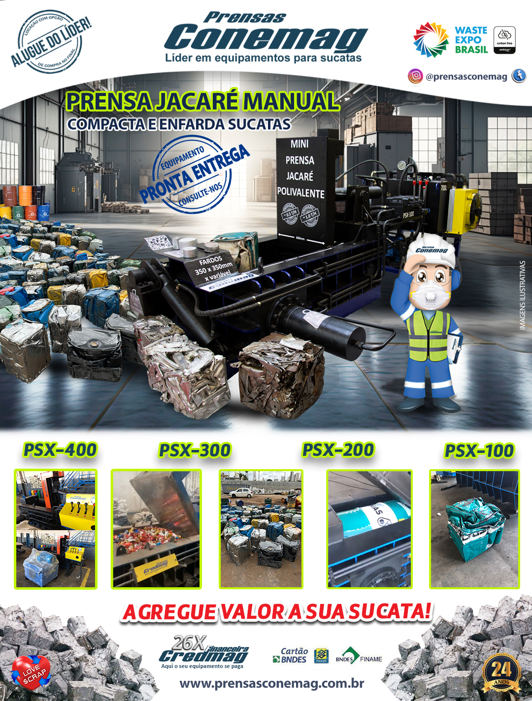 PSX – Prensa Jacaré Sucateira Conemag: Equipamento de alto desempenho e custo-benefício, disponível em versões manuais ou automáticas, adaptado às necessidades de cada cliente. Produz fardos de alta densidade, otimizando fundição, manuseio e transporte de materiais como ferro, alumínio, cobre, aço e outros tipos de sucata.